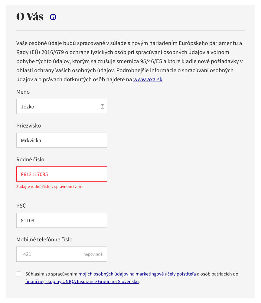 Při objednávání povinného ručení na stránce axa.sk můžete být upozorněni, že jste rodné číslo zadali "v nesprávném formátu" - je však problém v chybějícím lomítku nebo jste udělali překlep v čísle?