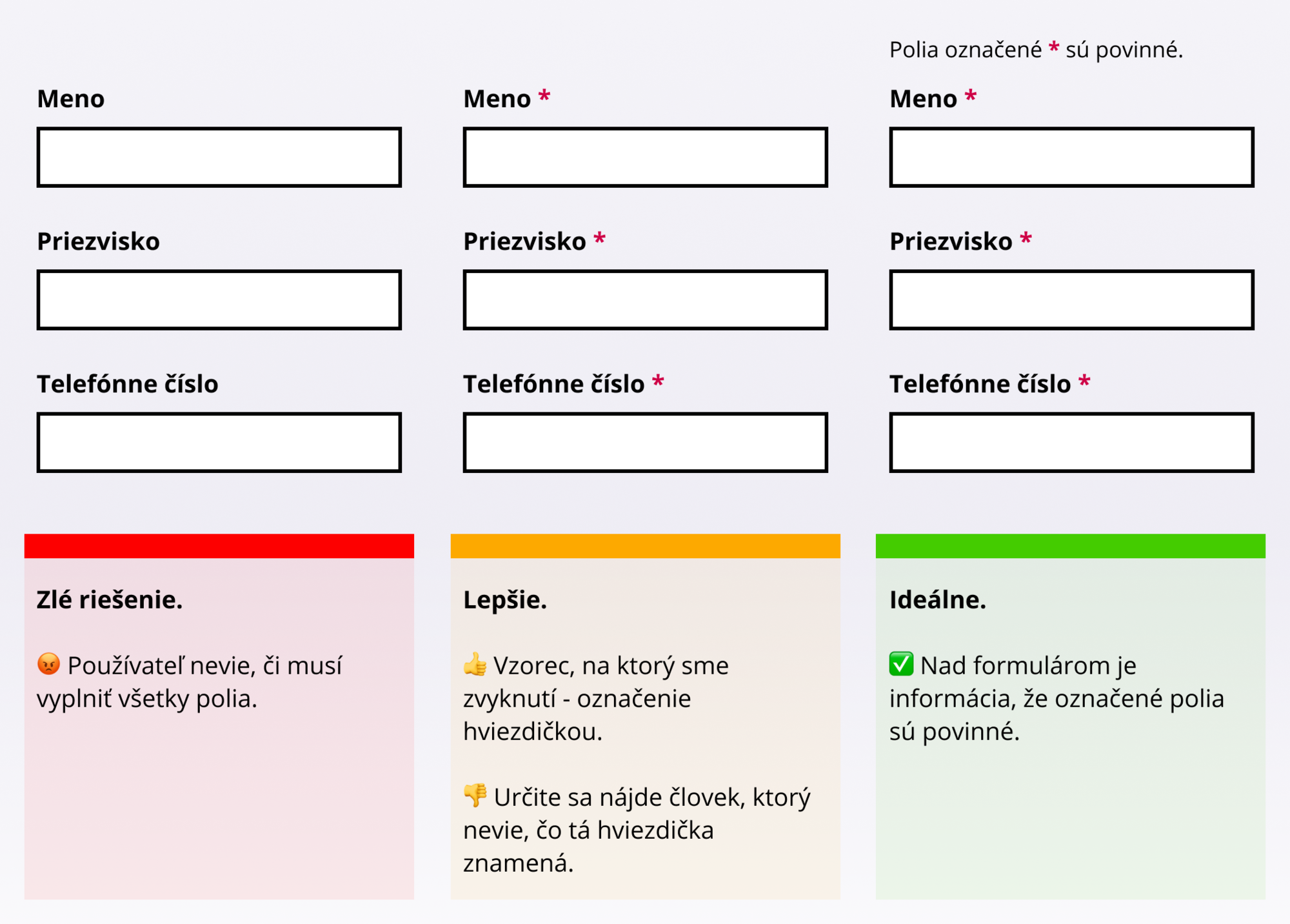 Lidé očekávají, že není nutné vyplnit všechny údaje. Automaticky hledají označení povinných částí, např. hvězdičkou a pod. (Ano, i když jsou všechna pole povinná.)