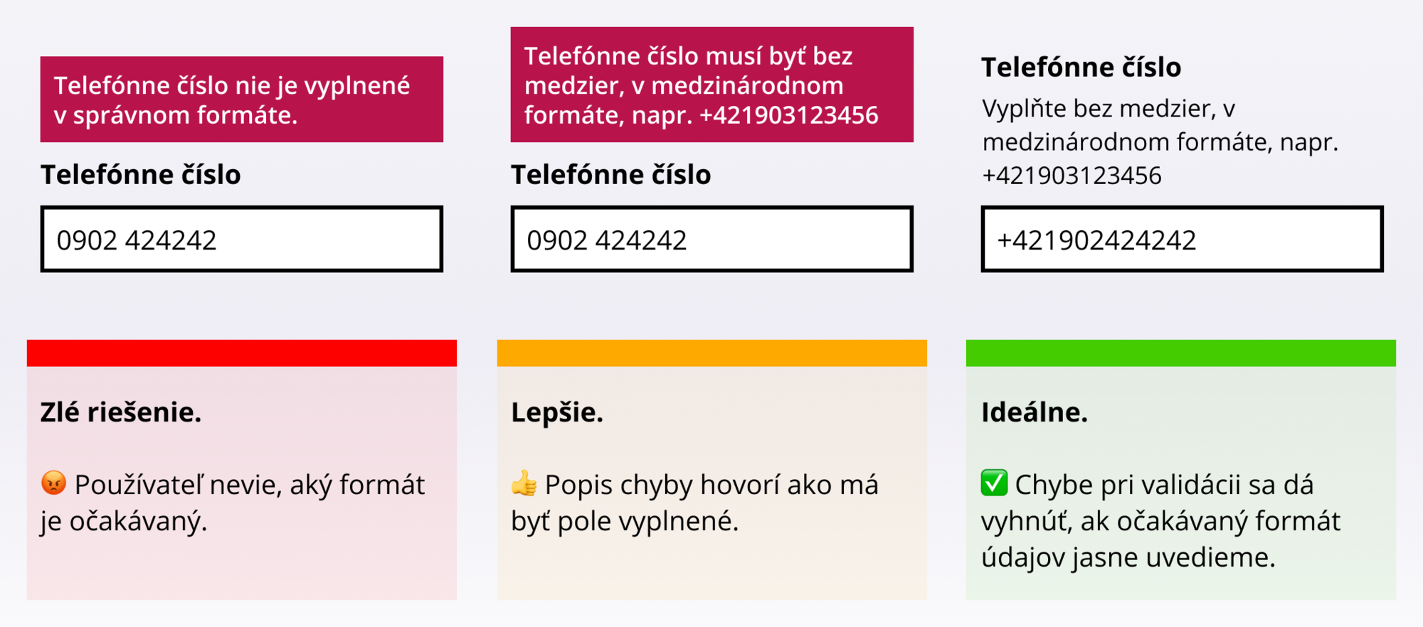 Mnohem častěji je však vyžadování telefonních čísel v mezinárodním formátu. Pokud provozujete web na Slovensku a většina vašich uživatelů je ze Slovenska, proč jim jednoduše nedovolit zadat číslo v lokální verzi? Po ověření, že formát je správný, si při ukládání do databáze slovenskou předvolbu jednoduše doplníte. A samozřejmě, povolíte zadat číslo i se zahraniční předvolbou.