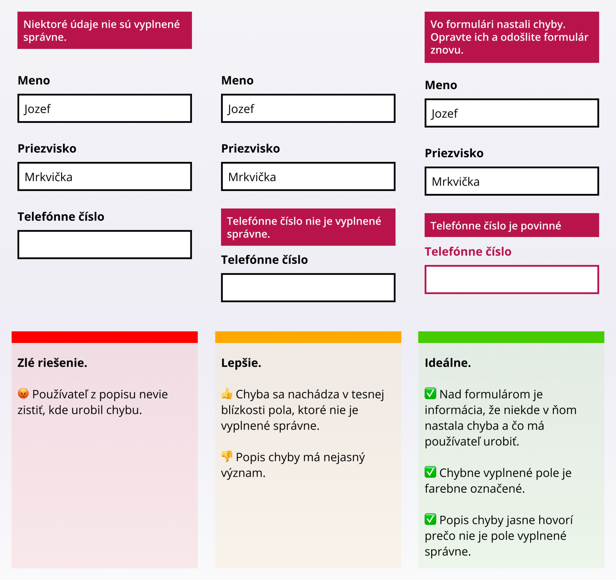 Pokud při vyplňování údajů nastane chyba, oznamte tuto informaci uživateli, ukažte kde se chyba stala, a také konkrétně informujte jak chybu opravit.