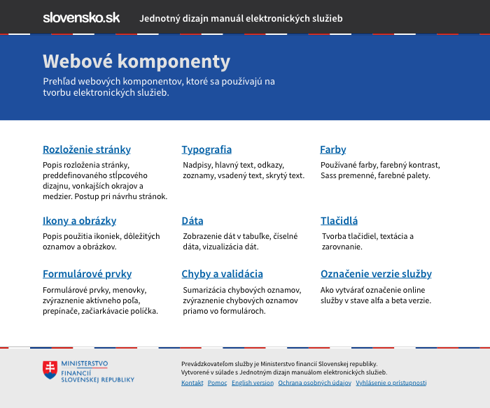 Pozn.: Jednotný design manuál elektronických služeb Slovenské republiky byl vytvořen v rámci SUXA (Slovenská user experience asociace) a ve spolupráci s Úřadem místopředsedy vlády SR pro investice a informatizaci.