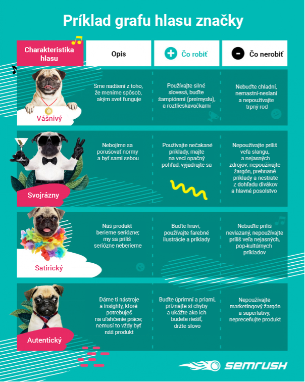 Příklad hlasové tabulky značky SEMRush ilustruje tyto různé druhy tónů a jak je co nejlépe používat.